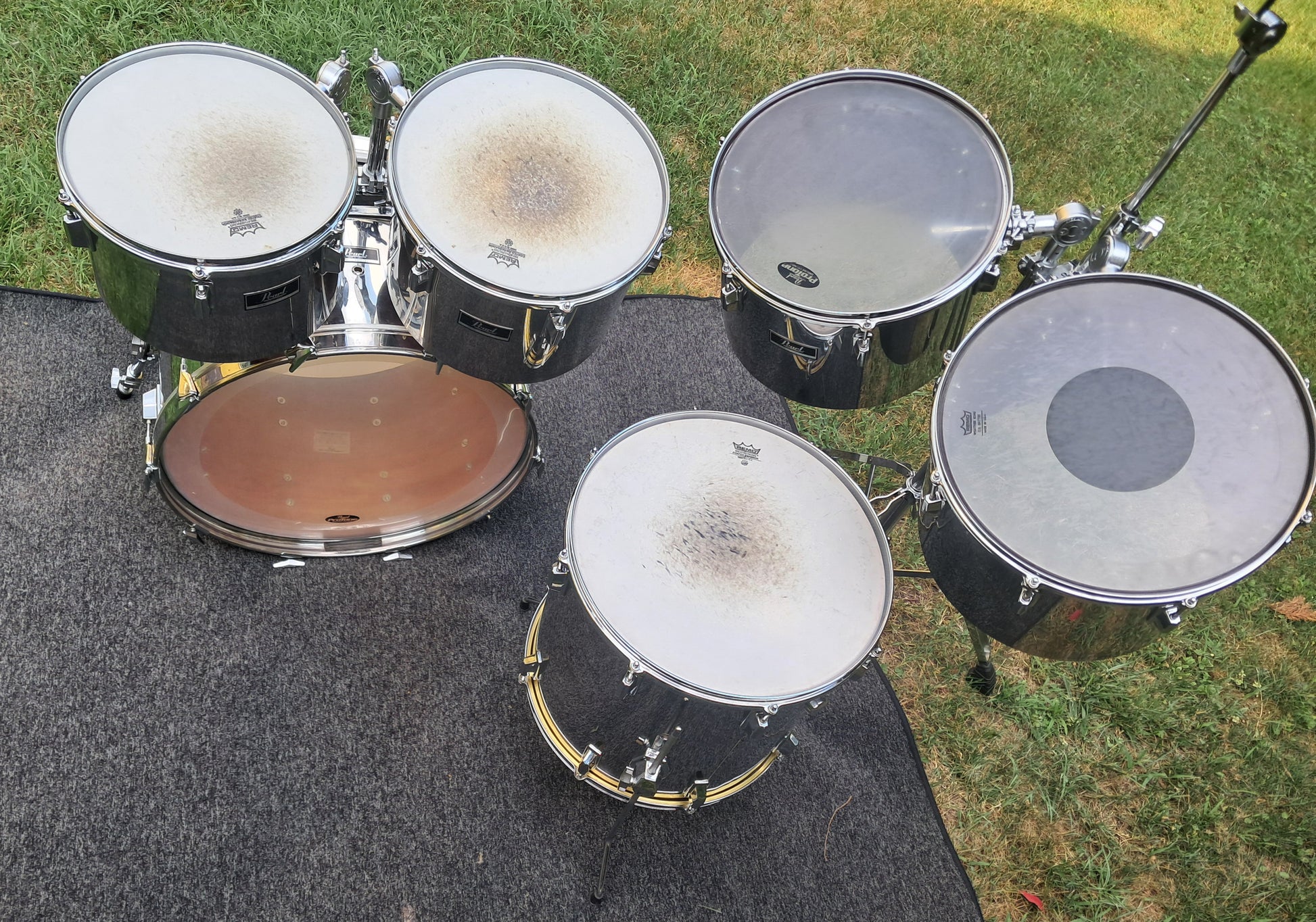 Set composto da 4 concert tom 12x8,13x9, 14x10 e 15x12 tutti in fenolico, ovvero un mix di fibra di vetro e legno, più timpano da 16x16 (con sordina interna) e cassa da 22x14, entrambi in legno; credo sia acero ma non ne ho la certezza assoluta